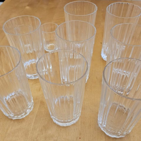 Myydään 6 kpl Relief juomalasia. Korkeus 6,5 cm, halkaisija 6 cm.