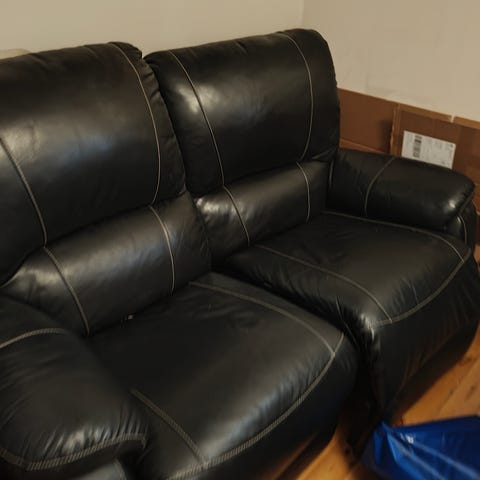 Kotimainen kolme vuotta vanha nahkasohva, kunto hyvä ja kaksi uudempaa mekanismituolia.