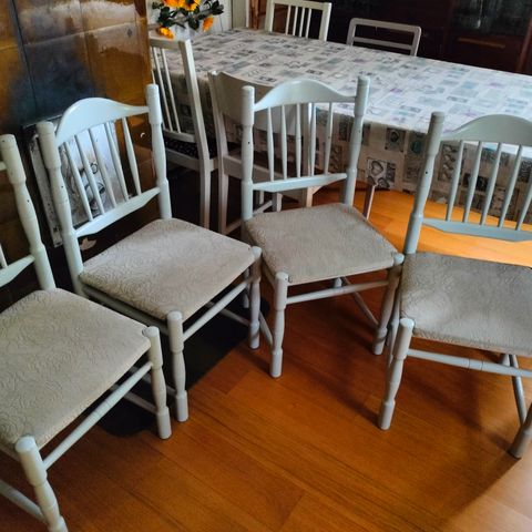 Elämää nähneet ruokapöydän tuolit 4 kpl. Istuimessa on jouset ja selkänojassa pehmusteet. Puuosat on kunnossa. Voi olla että kaipaa liimaa. Hieman koristenauhat repsottaa. Hinta 5€/kpl