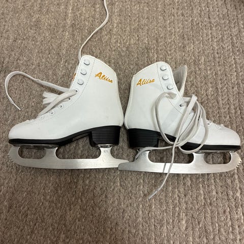 Viime talvena teroitetut, pieneksi jääneet Minni-luistimet odottavat seuraavaa luistelijaa. Teroituksen jälkeen luisteltu alle 10 kertaa.