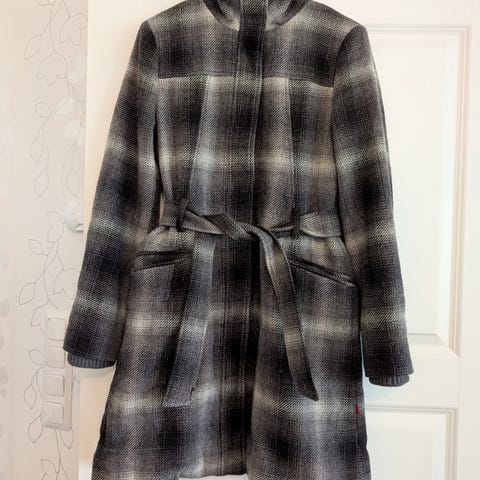 Kaunis mustavalkoruudullinen lyhyt villakangastakki kaksirivinapituksella. Paksua mohairmaista 60%villaa ja keinokuitua.
