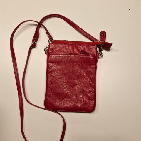 Punainen krokotiilinnahkakuvioinen nahkalaukku irrotettavalla ohuella olkahihnalla (pituus noin 110cm).