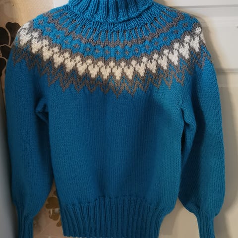 Käsin neulottu kaarrokeneule Icelandic wool langasta. Pit.edestä helmaan 67cm+kaulus, hihan pit.kain. ranteeseen 50cm. Ymp.mitta n. 110cm