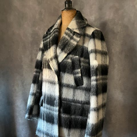 Pitkä villakangastakki, ”oversized” -tyyppinen.