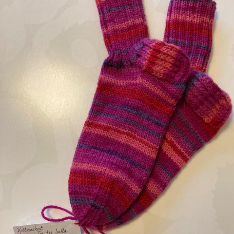 Oranssikukkaiset sukat noin kokoa 37 Seitsemän veljestä langasta