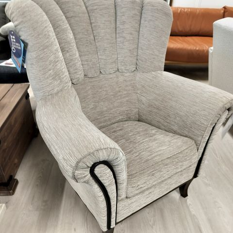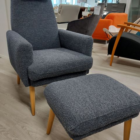 Nojatuoli sekä rahi on verhoiltu Lauritzon Lamm -kankaalla jonka hankauksen kesto on 40000.