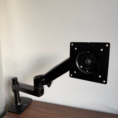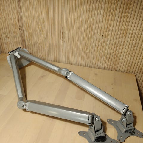 Vuoden käytössä ollut näytön teline. Asennus vaatii reiän pöytäpintaan. Tukeva, säädettävä, 4 pisteestä taittuva, kätevä!