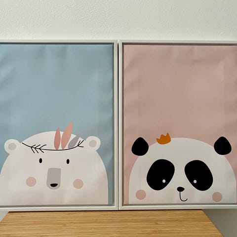 Kaksi lastenhuoneen taulua nalle aiheella. Taulun koko 45x55 cm. Hinta per kpl.
