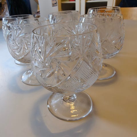 Myydään kuvan kristalliset konjakkilasit, 6 kpl. Ehjät, kirkkaat, ei jälkihiottu. Hinta yhteensä 30,-. Yksitellen 8,- kpl. Nouto Suonenjoelta.