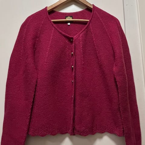 Pariisista vintageliikkeestä ostettu neuletakki napeilla. Mukana kimallelankaa. Ei kokolappua, mutta itse olen kokoa M ja sopiva koko, väljä malli.