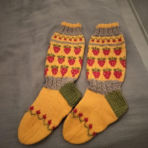 Korallinpunaiset villasukat valkoisilla koristeraidoilla