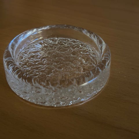 Sarpanevan suunnittelema kauniskuvioinen lasinen kuppi. Sopii kynttilän/ tuikun alustaksi tai tarjoilukupiksi. Halkaisija ~10,5 cm, kork ~2,5 cm.