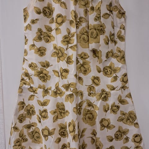 Jonkun itsensä ompelema kukkahame. Molemmissa reunoissa halkiot n. 28 cm. Takana vetoketju 19 cm ja nappi.