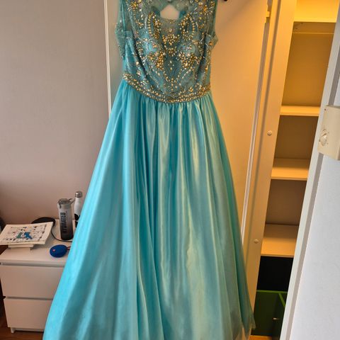 Myydään kerran vanhojentansseissa käytetty täyspitkä, olkaimeton mekko. Käyttäjä ollut n. 170cm. Koko 42-44, selän nyörikiinnityksellä koko säädeltävissä. Väri ruskea, edessä ja vyötäröllä helmikirjailua, joka näkyy kuvissa.