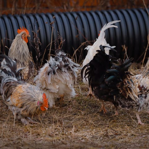 Leghornin kukko ja kaksi munivaa kanaa