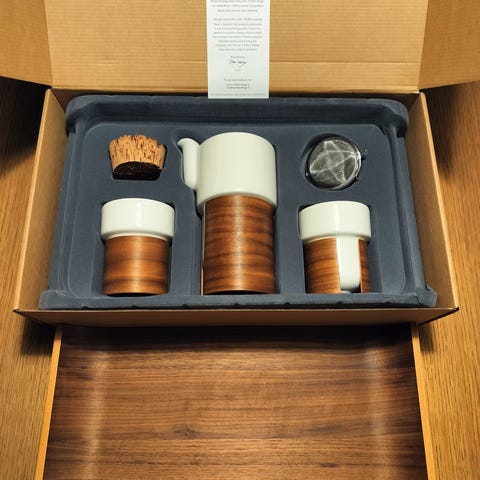 Myydään Tonfiskin Warm-tarjoilusetti isommalla kaatimella (1,1 litraa), kahdella mukilla, tarjottimella, sekä lisäksi kannun erillinen lämmitin ja teesihti. Väri posliiniosissa musta, puiset osat pähkinänvärisiä ja kaatimen kansi on luonnonkorkkia.
