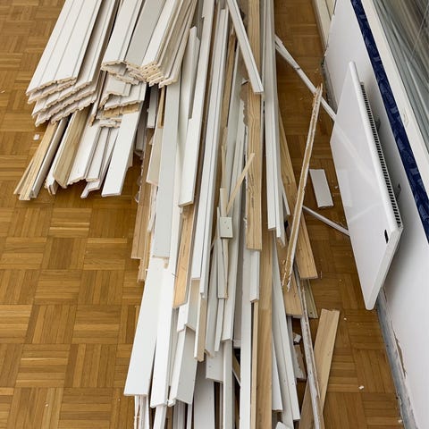 Sisätiloissa säilytetty kasa (noin 35 m2) siistejä käytettyjä mdf jalkalistoja, värinä tammi. Pisimmät listat yli 3m. Tule ja hae pois