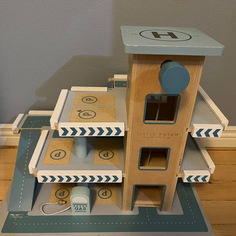 Käy parkkihallissa tankkaamassa polttoainetta, pysäköi auto ja pese se autopesulassa. Puinen parkkihalli on yksi monista leikkisarjoista, jonka voi liittää Little Dutch -rautatieasemaan. Autotallissa on helikopteri sekä puuhahmoja ja -elementtejä joissa yksityiskohtaiset kuvat molemmin puolin.