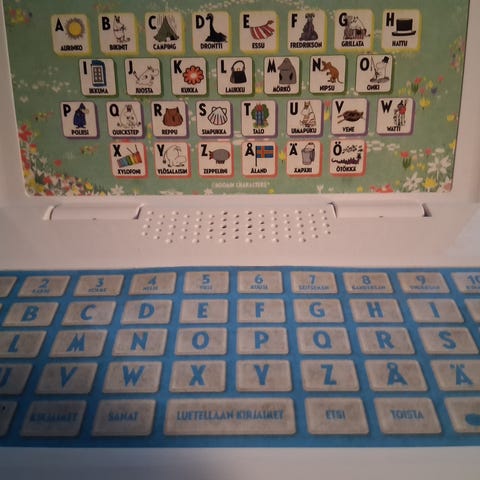 Hauska Muumi-aiheinen läppäri opettaa lapselle numeroita ja kirjaimia sekä sanoja ja tavaamista. Iloinen musiikki viihdyttää leikkivää lasta.