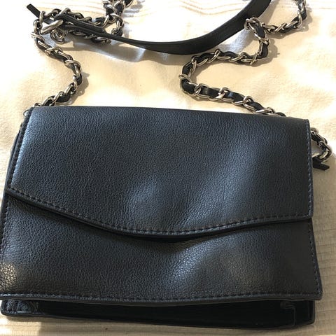 Glitteristä ostettu musta pikkulaukku. Mitat n. 21,5cm x 14cm x 6cm. Käytetty, mutta hyvässä kunnossa, ainut virhe vetoketjun vierestä rispaantunut päällinen ja pienet jäljet hihnassa (kuvassa).