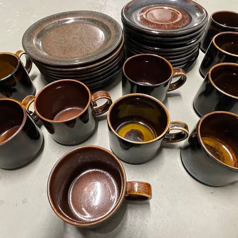 Arabia, kahvikupit + lautaset Soraya, 8 kpl. Suunnittelija Gunvor Olin-Grönqvist. Vuosi, 1972. Kupin korkeus 5,8 cm, halkaisija 6,5 cm. Lautasen halkaisija 14.