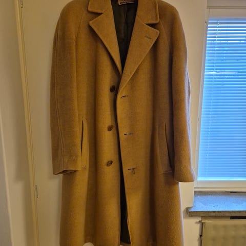 Vanha miesten päällystakki 1950 luvulta. Tummanharmaa, leveä malli. Vuori tav. musta vuorikangas. Mitat: ry 120 cm, olalta helmaan 98 cm, raglanhiha kaulan juuresta hihansuuhun 82 cm. Olalta olalle n 50 cm. Tavallinen napitus. Ehjä ja siisti muuten, mutta oikeassa hihassa on muutama kohta, josta kankaan nukkaa on pinnasta kulunut. Kokoa on hankala arvioida, koska sitä ei ole mainittu. Mitat antavat hieman osviitta. Niskan lenkissä teksti: Tuomisen Puku Oy, rinnassa sisällä lappu :Tuomi, Simolan asuste Hyvinkää. Postitus tai nouto.