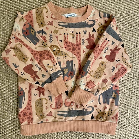 Matalan-merkkinen vaaleanpunainen collegepusero, jossa printtikuvioita sekä etu- että takapuolella.