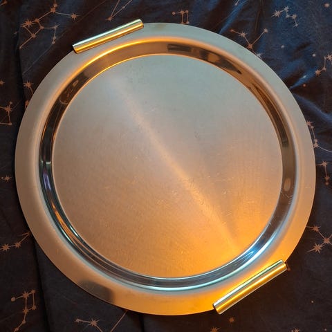 Vati, katelautanen, tarjotin ruostumatonta terästä. Halkaisija n. 32 cm. Alla kaiverrus Fazer Catering. Kunto hyvä.