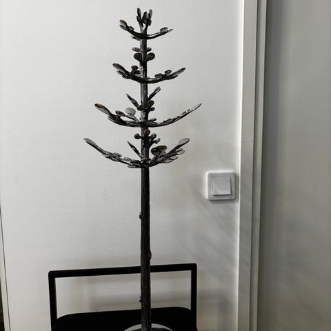 Kokonaiskorkeus n. 39 cm ja alaosan halkaisija n. 17 cm. Metallia ja tosi tukeva. Mahtuu paljon koruja!