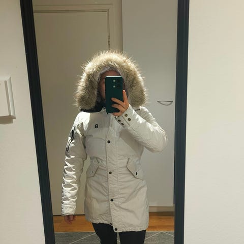 Takin kokonaispituus on 85 cm. Takissa ei ole kaulusta, mutta erittäin kiva muunnella erilaisilla huiveilla. Kunnoltaan takki on siisti ja hyväkuntoinen.