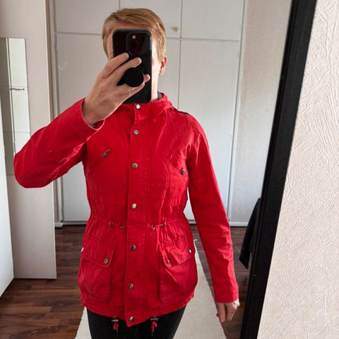 Tummanvihreä parkatakki. Kokolapussa lukee S, mutta enemmänkin M-kokoa todellisuudessa. Kai-kai 51cm, pituus kainalosta helmaan 58cm, hihan sisäpituus 51cm. Edessä isot taskut. Kiristysnyörit helmassa ja vyötäröllä. Kaksiosainen huppu, sisempi osa joustavaa puuvillaa.