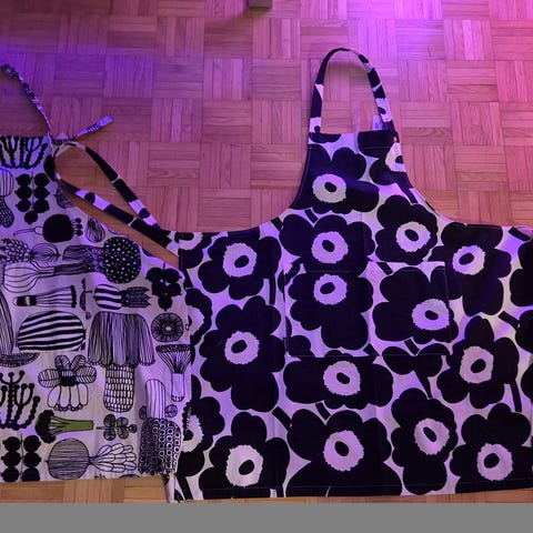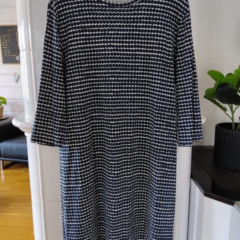 Ostaisin kuvan mukaiseen Marimekon essumekkoon mustavalkoisen vyön. Tarjoa kuvan kera. Ks. raitojen suunta.