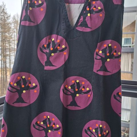 Jonkun joskus itse ompelema puuvillakankainen vuoritettu mekko, jossa piilovetoketju selässä. Vastaa kokoa 36-38, kai-kai 46 cm ja olka-helma 93 cm. Siisti, ehjä ja raikastuoksuinen retrovaate.