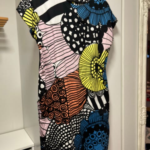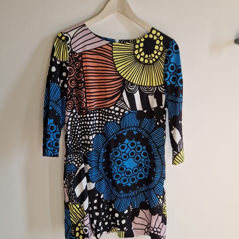 Myydään vähänkäytetty Marimekon Siirtolapuutarhamekko. Koko 38. Hihat, taskut, vuori.