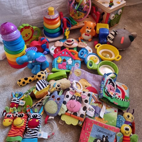 Kuvassa olevat lelut myydään pakettina seuraavalle leikkijälle. Kaikki yhteensä 10 €.