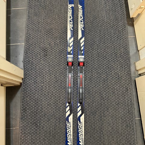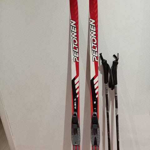Peltonen delta sukset. Kouluhiihdoissa lähinnä käytetty. Jonkin verran on voidetta pohjissa.