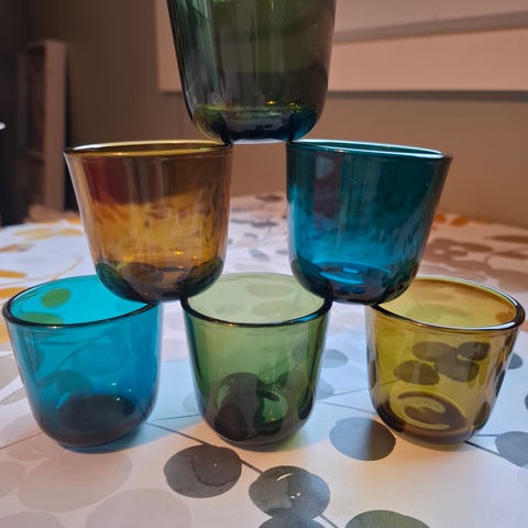 3 kpl värillisiä juomalaseja.Korkeus 8cm,halkaisija 8cm.Hinta yhteensä 10:- .Yksittäin 8:- .Kulumajälkeä löytyy tietysti. Nouto