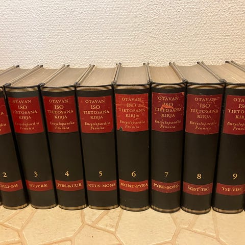 15-osainen Otavan Iso tietosanakirjasarja vuosilta 1931-1939 sekä kaksi täydennysosaa (1957 ja 1958).