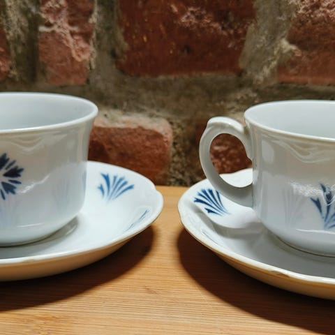 Viisi Arabian kahvikuppia ja niille lautaset. Vanhat, mutta ehjät. Kaikki yhteensä 4e