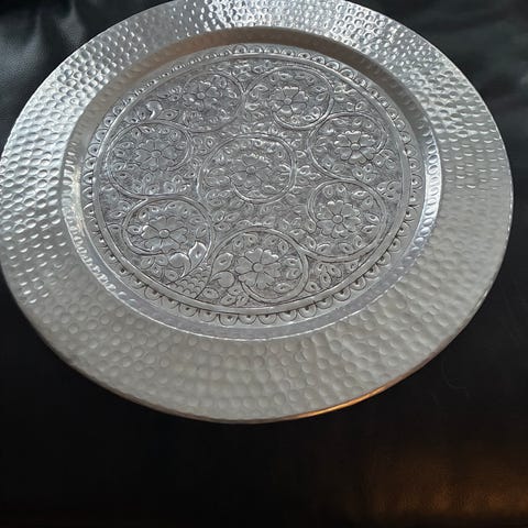 Kreikasta tuotu tarjotin. N. 60cm halkaisija. Jotakin metalliseosta. Ei ruostetta. Väri epätasainen.