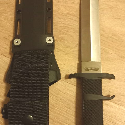 Täydellisessä kunnossa oleva 440c teräksestä valmistettu veitsi. Kahvapalat micartaa. Koko veitsi valmistettu yhdestä palasta terästä mikä tekee siitä todella kestävän. Veitsen mukana tulee säilytys laatikko. Terän pituus 19cm. Ja mukana myös nahkainen tuppi.