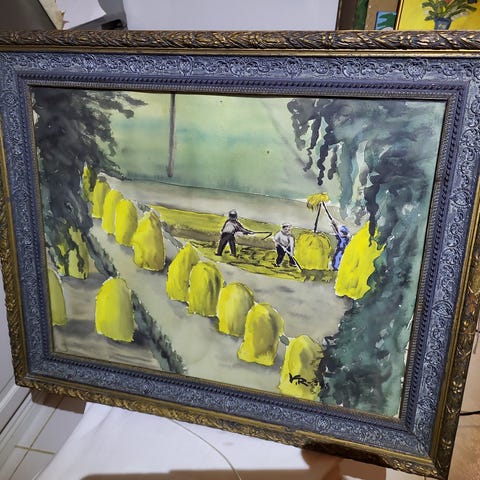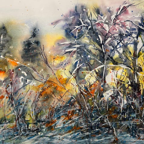 S. R. akvarellityö Mäntymetsä vuodelta 1928. Työn korkeus on 49 cm ja leveys 38 cm. Lasikehys.