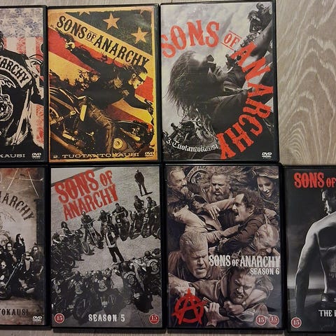 Sons of anarchy, dvd. Kaudet 1-5. Suomitekstitykset. Hyväkuntoiset levyt ja kotelot. 20e. Myynnissä myös muualla.
