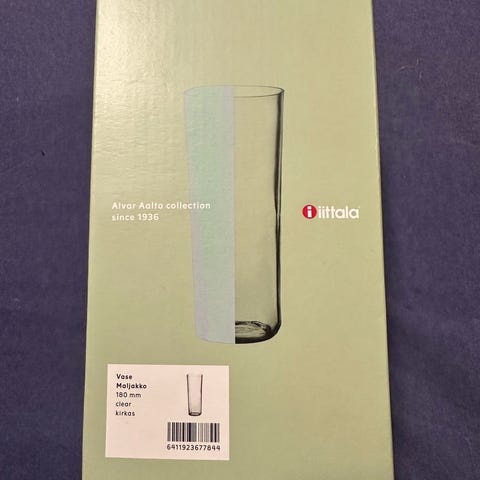 Käyttämätön, paketissaan säilytetty Aalto vaasi, korkeus 120 mm. Väri on sade, jonka valmistus lopetettu vuonna 2019.