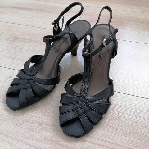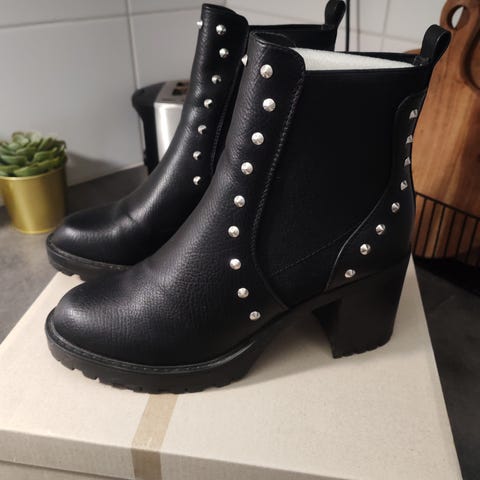 H&M:n mustat tekomokkaiset nilkkurit koossa 40. Korko noin 11 cm. Siistissä kunnossa, mutta vasemman kengän korossa pinta kulunut.