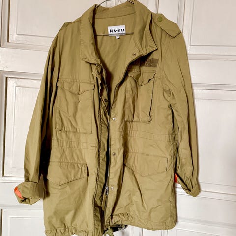 Vuoriton syksy / kesätakki armeijatyylisellä leikkauksella ja napituksella. Istuu vyötäröltä napakasti.