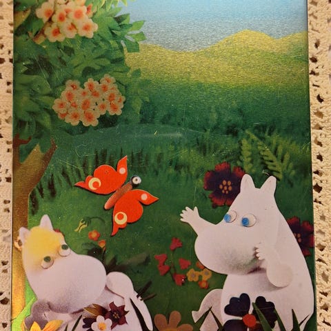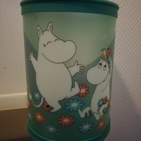 Vanha peltinen Muumi rasia. Kannessa niiskuneiti ja sivuilla muita hahmoja. Peltinen ja kuvat ovat vähän jo kuluneet.