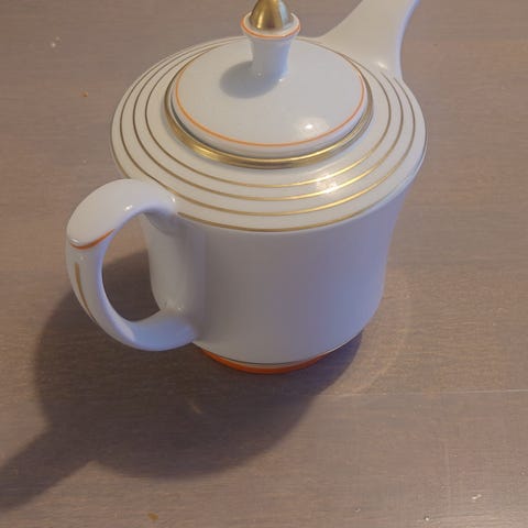 Myydään vanha kahvikannu/ tee- kannu ARABIA, Raitakulta ,leima 1932-1949, suunn: Greta Lisa Jäderholm- Snellman, kork.ilman kantta 14cm leveys 14cm, kultaukset ja lasitukset kunnossa , ei säröjä.