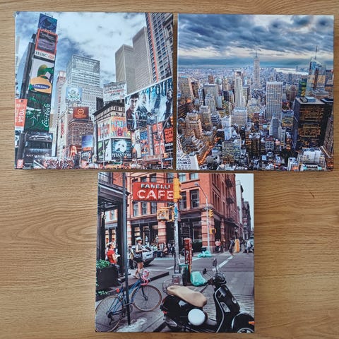 Hieno iso New York -taulusarja, joka on tilattu ulkomailta. Taulusarja koostuu viidestä erillisestä taulusta. Yksi tauluista on hieman ottanut osumaa alareunaan. Kuvista näkyy jälki.