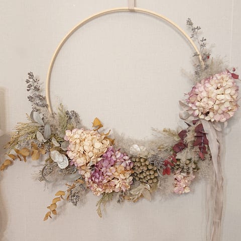 Myydään näyttävä, floristin käsinsitoma uniikki kuivakukkakranssi. Ihana, herkkä, trendikäs sisustuselementti omaan kotiin tunnelmaa tuomaan tai lahjaksi. Kranssirengas on vaaleaa puuta, sidonnassa käytetty mm. Eucalyptusta, elefanttiheinää, pampaheinää, syyshortensiaa, lunariaa, tuijaa ja puuvillan kukkia. Kranssin halkaisija leveimmästä kohdasta mitattuna n. 37 cm.